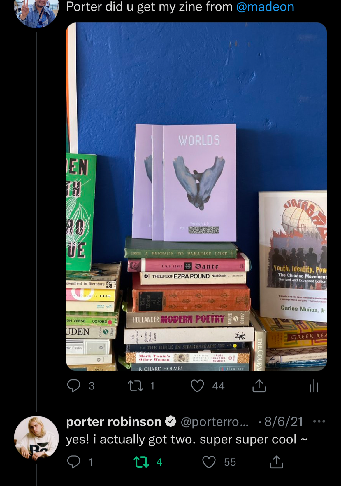 The same summer I broke up with that ex, I was determined to get my zine, Worlds Version 1.0 to Porter Robinson. I brought 3 copies to Madeon’s DJ set at the Roxy. I went alone with a mission. I was sure Porter could be there. I stayed at the barricade the whole set, tossing two zines on stage… One at the beginning, one after Porter appeared to play Shelter. At the end of Madeon’s set I knew I had one last chance. I rushed to the opposite side of the stage where I realized hew would exit only moments before. I personally handed Hugo a copy of the zine and said this is for Porter. Soon after I bugged Porter every day on Twitter until finally he said he received the zine. I cried for hours.